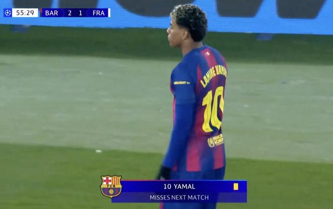 欧冠联赛阶段第6轮,巴塞罗那主场对阵法兰克福,下半场亚马尔领到一张黄牌,这位巴萨边锋将因累计黄牌停赛缺席下一轮欧冠比赛。